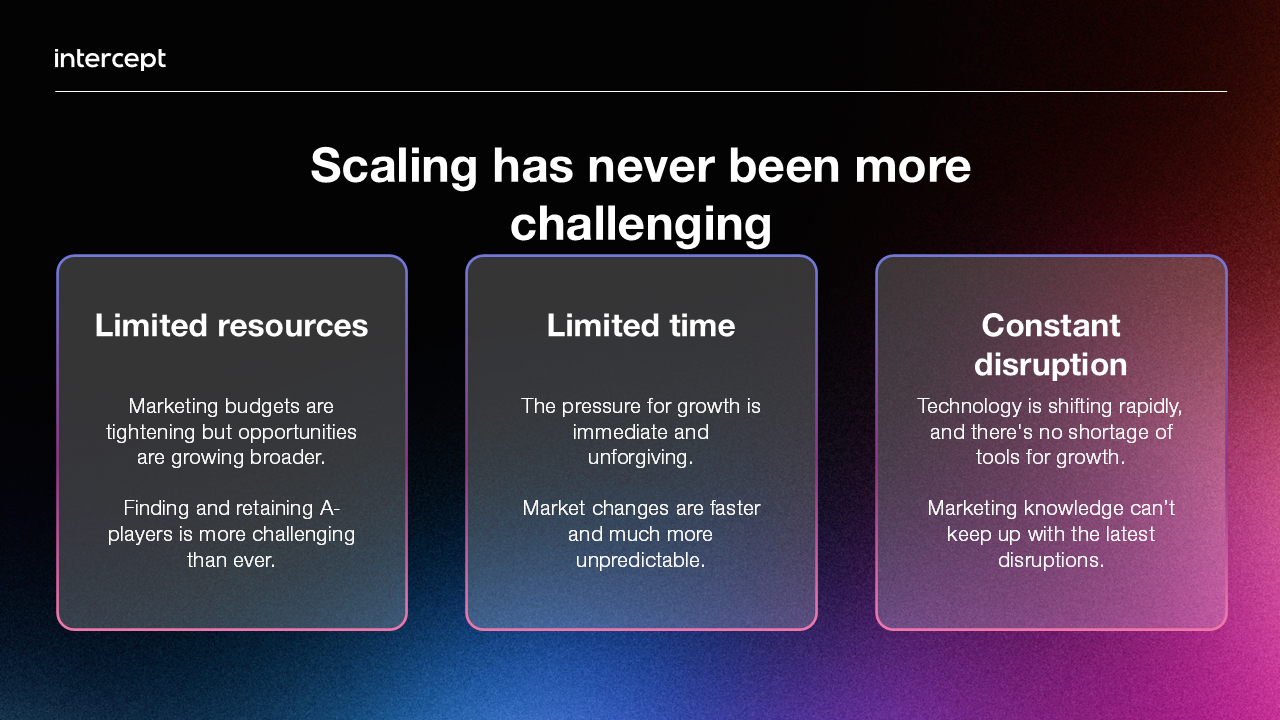 Scale was intended as the bold and boundary-defying counterpart to the Intercept brand, bringing vibrancy, dynamism, and memorability. The original brand direction for Scale felt dull and outdated, and when the project landed in my hands, the design required a full rework to align with the intended vision.